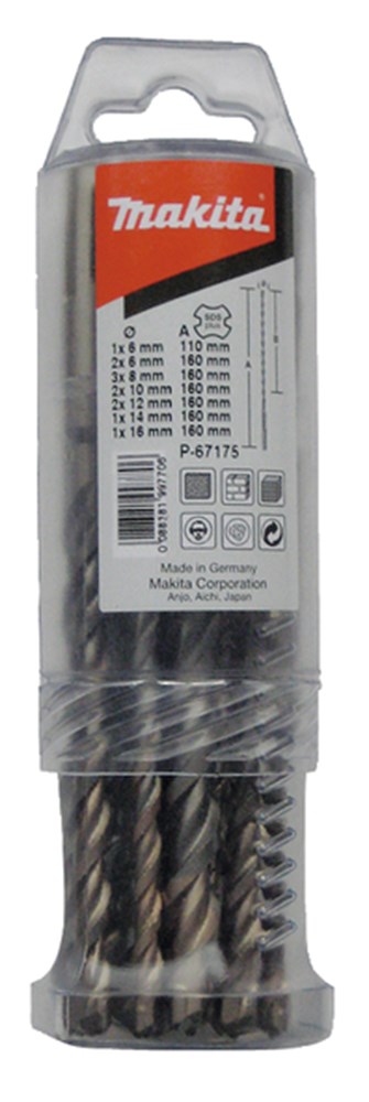 Diverse sets met SDS-plus betonboren en beitels. 12-delige SDS V-PLUS betonborenset: 6x110mm, 6/10/12x160mm (2), 8x160mm (3), 14/16x160mm.