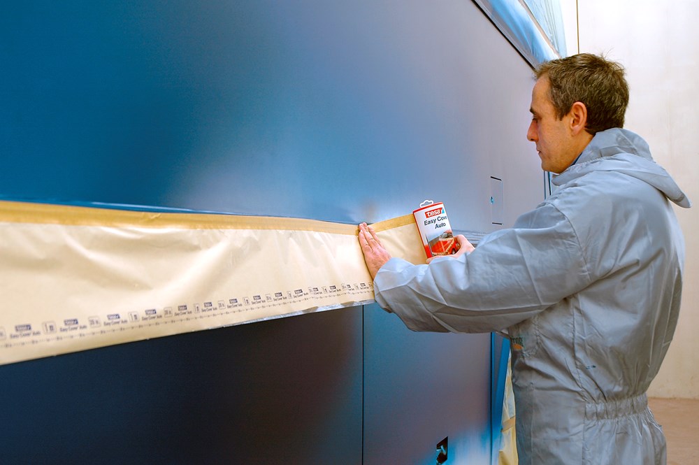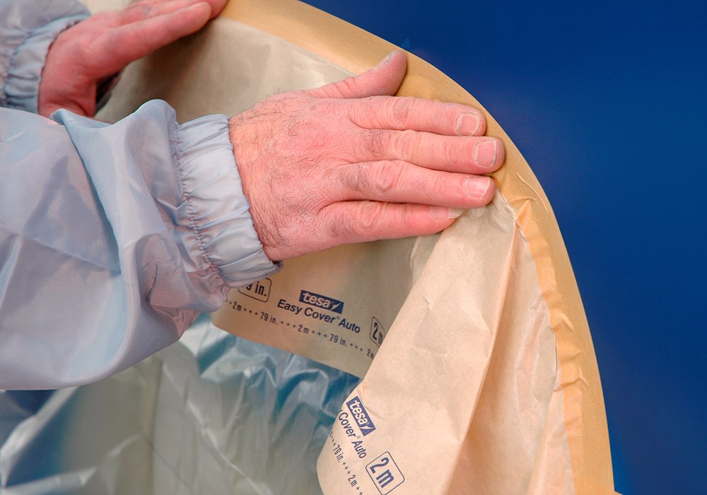 tesa® 4378 Easy Cover® Auto is een voorverwerkte maskeringstape die de carrosserie beschermt tegen verfspuitdeeltjes en druppels. Deze 3-in-1 oplossing bestaat uit een heel elastische en resistente, licht gecrêpte papieren maskeringstape (tesa® 4309), een maskerende papieren bescherming voor precieze verfranden en uitstekende verfabsorptie en een scheurvaste HDPE-beschermfolie die perfect aan de verf hecht. Dankzij de gemakkelijke uitrolbaarheid is de maskeringsoplossing voor auto's gemakkelijk in gebruik en kan hij zonder problemen verwijderd worden.
