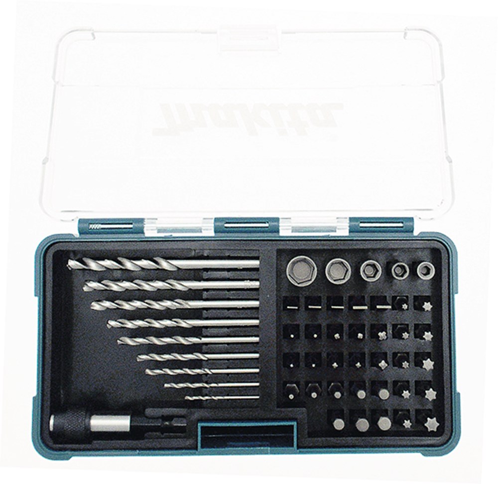 Assortiment van diverse boren en schroefbits. 48-delige boor- en schroefset. Inhoud: HSS-G metaalboren 1,5/2/2,5/3/3,5/4/4,5/5/6mm, schroefbits 25mm: PH1 (2), PH2 (2), PH3, PZ1 (2), PZ2 (2), PZ3, SL4,5, SL5,5 (2), SL6,5 (2), T10, T15 (2), T20 (2), T25 (2), T30 (2), T40, HEX2, HEX2,5, HEX3, HEX4, HEX5 (2), HEX6 (2), bitdoppen 4/5/6/8/10mm een magnetische bithouder 60mm.