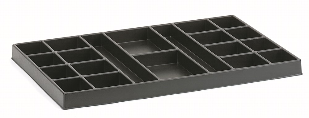 Met vakken voor kleinmateriaal zoals schroeven, moeren enz. Olie- en skydrolbestendig. 8 vakken 60 x 80 mm, 8 vakken 80 x 80 mm, 2 vakken 100 x 165 mm, 2 vakken 50 x 330 mm.