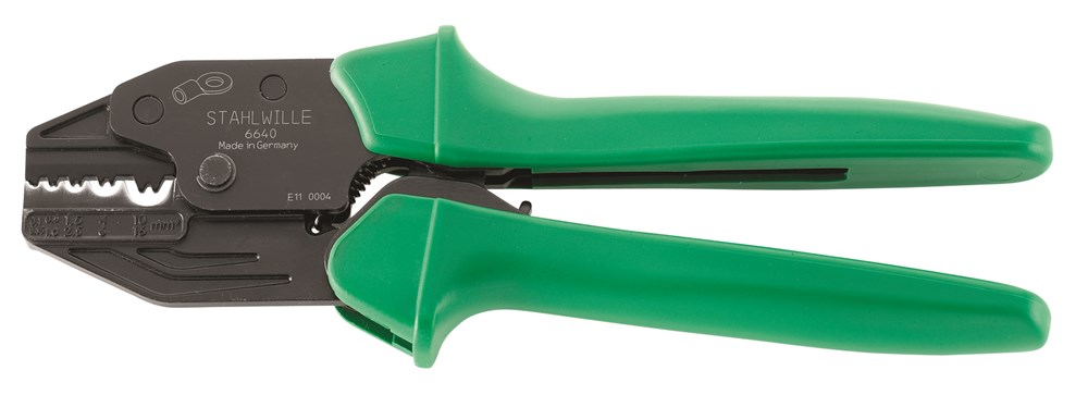 Voor niet geïsoleerde kabelschoenen en buiskabelschoenen met gesloten krimphuls ontgrendelbare dwangblokkering eenvoudig in gebruik strip- en knipbek zie nr. 6966 krimpprofiel.