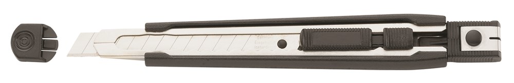 Met drie afbreekmesjes 9 mm (1 mesje gemonteerd, 2 mesjes in het magazijn). Schuifgedeelte met blokkering. Met mesjesafbreker en beschermkap. Met mesjesgeleiding uit edelstaal. Geschikt voor het snijden van karton, rubber, leer, hout enz. Behuizing uit zamac.