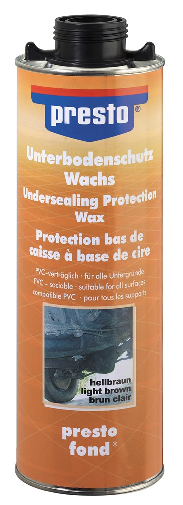 Presto chassisbescherming op wax basis is een doeltreffende en zeer zelfklevende roestbescherming voor behandelde en onbehandelde onderkanten. Een resistente beschermende laag vormt zich zodra het gedroogd is, die bestand is tegen weer, strooizout en zuren. Beschadigt plastic, lak of rubber niet. Product beschikbaar in 500ml spuitbus en in 1 liter verpakking voor gebruik in spuitpistool.