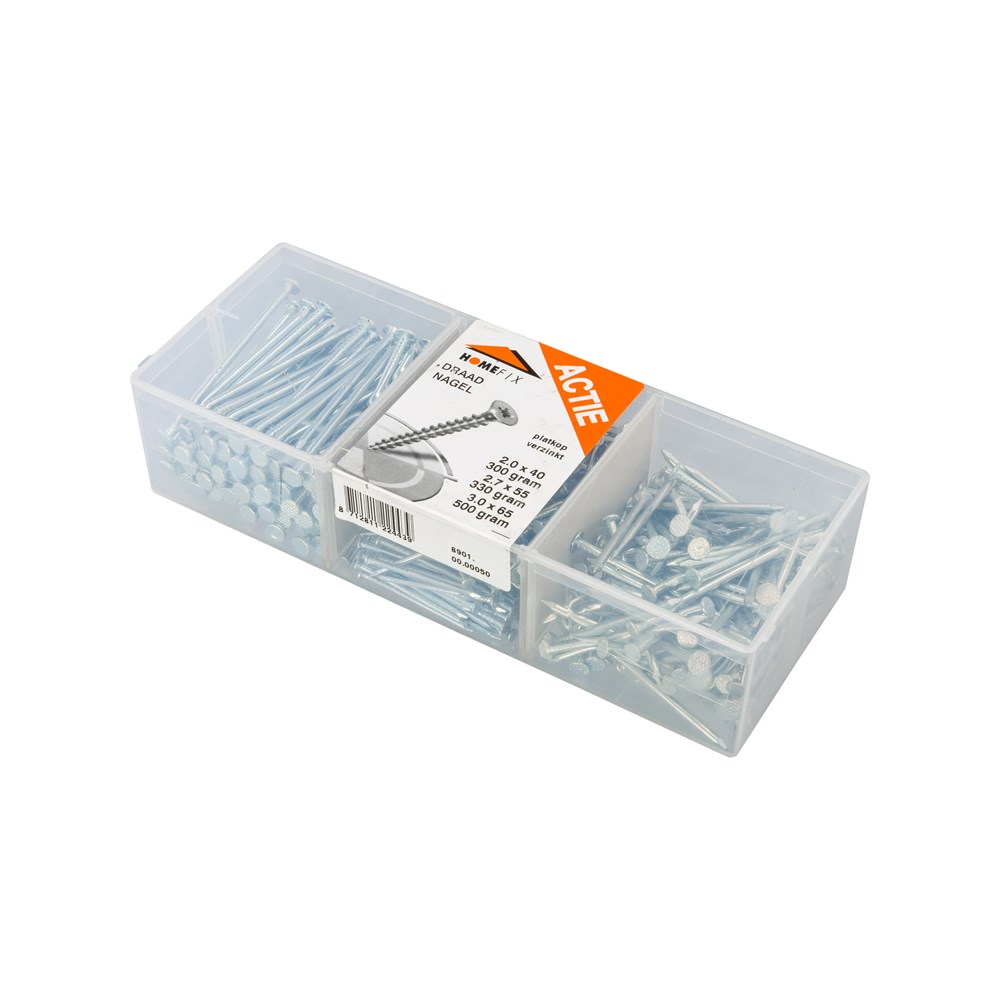 Handige 7-vaks organizer gevuld met verschillende maten stalen draadnagels verzinkt.