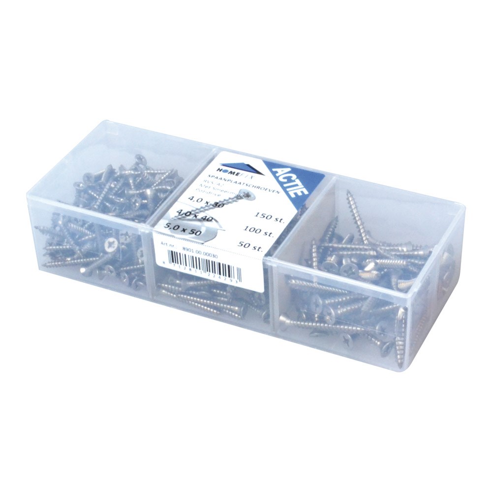 Assortimentverpakking met 3 verschillende maten spaanplaatschroeven platkop RVS-A2 pozidrive.