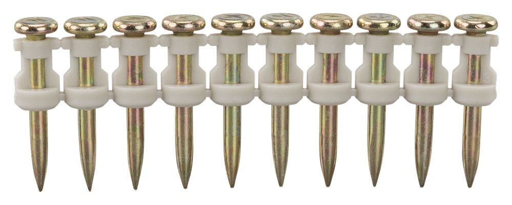 Betonnagels voor het bevestigen van metal stud en hout op beton voorzien van gegalvaniseerde coating. 1 gaspatroon meegeleverd. 10 nagels per strip. Het is ook mogelijk om de nagels op staal te bevestigen . Aanbevolen penetratie diepte per betonklasse: C16/20 25-28 mm C20/25 20-22 mm C25/30 15-20 mm C30/37 15-18 mm Aanbevolen penetratie diepte per staalsterkte: 350 N/mm2 6,5 mm Prijzen zijn aan verandering onderhevig. Passend op Makita Model: GN420CLSE, GN420CLZK