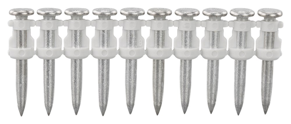 Betonnagels voor het bevestigen van metal stud en hout op beton voorzien van mechanische zink coating. 1 gaspatroon meegeleverd. 10 nagels per strip. Het is ook mogelijk om de nagels op staal te bevestigen. Aanbevolen penetratie diepte per betonklasse: C40/50 13-16 mm C50/60 12-15 mm Aanbevolen penetratie diepte per staalsterkte: 410-450 N/mm2 6,5 mm 500-550 N/mm2 6,5 mm Prijzen zijn aan verandering onderhevig. Passend op Makita Model: GN420CLSE, GN420CLZK