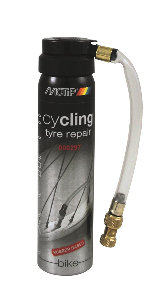 Kwalitatief hoogwaardige spray voor het uitvoeren van noodreparaties aan banden van fietsen en bromfietsen.