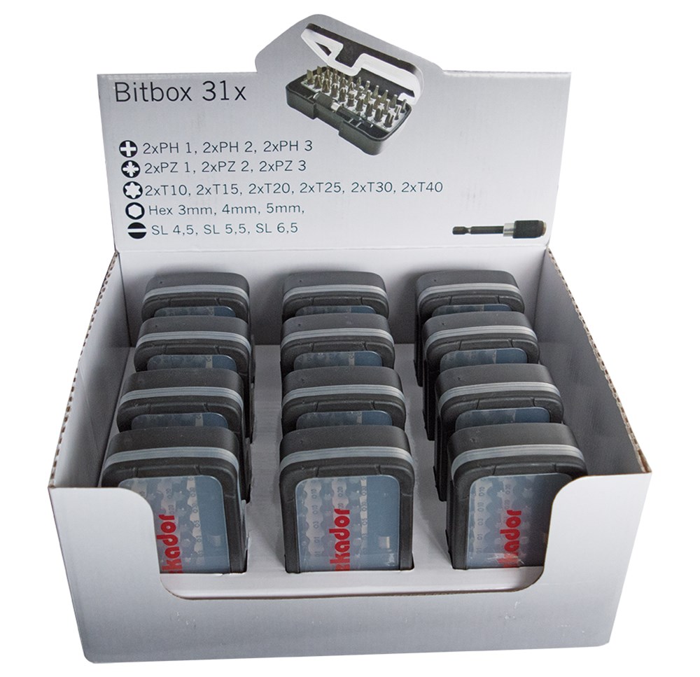 • 2 x PH1 x 25 mm • 2 x PH2 x 25 mm • 2 x PH3 x 25 mm • 2 x PZ1 x 25 mm • 2 x PZ2 x 25 mm • 2 x PZ3 x 25 mm • 2 x TX10 x 25 mm • 2 x TX15 x 25 mm • 2 x TX20 x 25 mm • 2 x TX25 x 25 mm • 2 x TX30 x 25 mm • 2 x TX40 x 25 mm • 1 x magn. Bithouder/porte-embouts 58 mm • 1 x SW3 • 1 x SW4 • 1 x SW5 • 1 x 4,5 x 0,6 mm • 1 x 5,5 x 0,8 mm • 1 x 6,5 x 1,2 mm