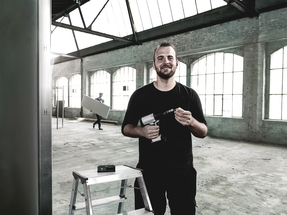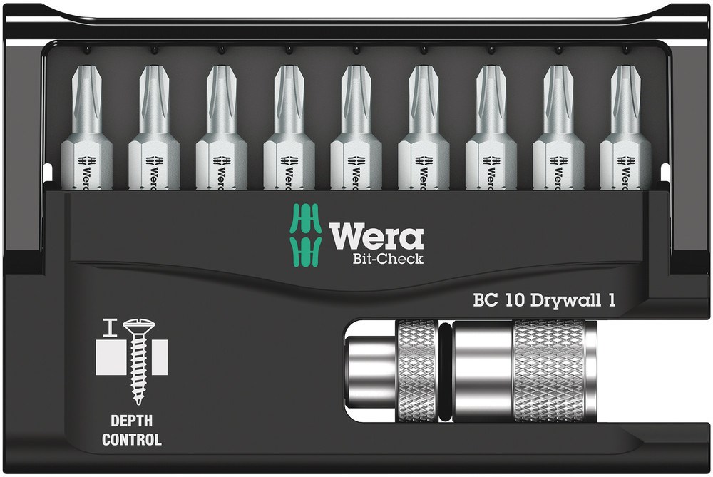 Bit-Check voor gebruik in de droogbouw; hoogwaardige afstandshouder van aluminium; de schroefdiepte kan traploos worden ingesteld en maakt naar wens verzinken van schroeven mogelijk; 9 droogbouw-bits met aangepaste aandrijfschacht; 25 mm lang.