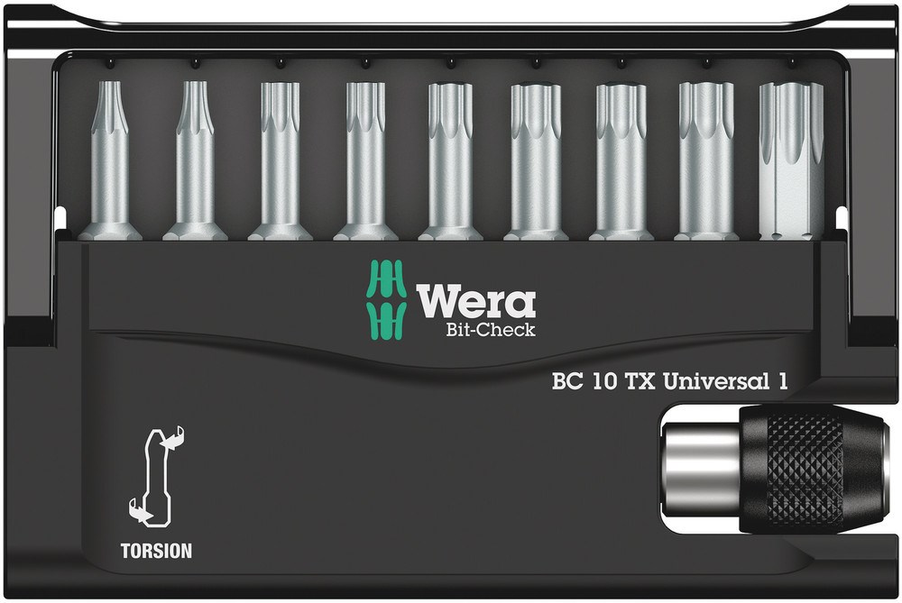 Robuuste Bit-Check van Wera. Bij Bit-Checks heeft u steeds een goed overzicht over het beschikbare gereedschap. Bits die niet nodig zijn voor de werkzaamheden, kunnen in het assortiment worden teruggeplaatst en raken zo niet kwijt. Eenvoudig mee te nemen, bijv. in een borstzak. Inclusief universele houder met snelwisselfunctie. Voor de plaatsing van bits met 1/4" buitenzeskant-aansluiting, conform DIN ISO 1173-C 6,3. Voor opname in de schroefmachine of in de boorkop van de elektronisch geregelde boormachine. Inclusief extreem harde TORX® bits voor universeel gebruik.