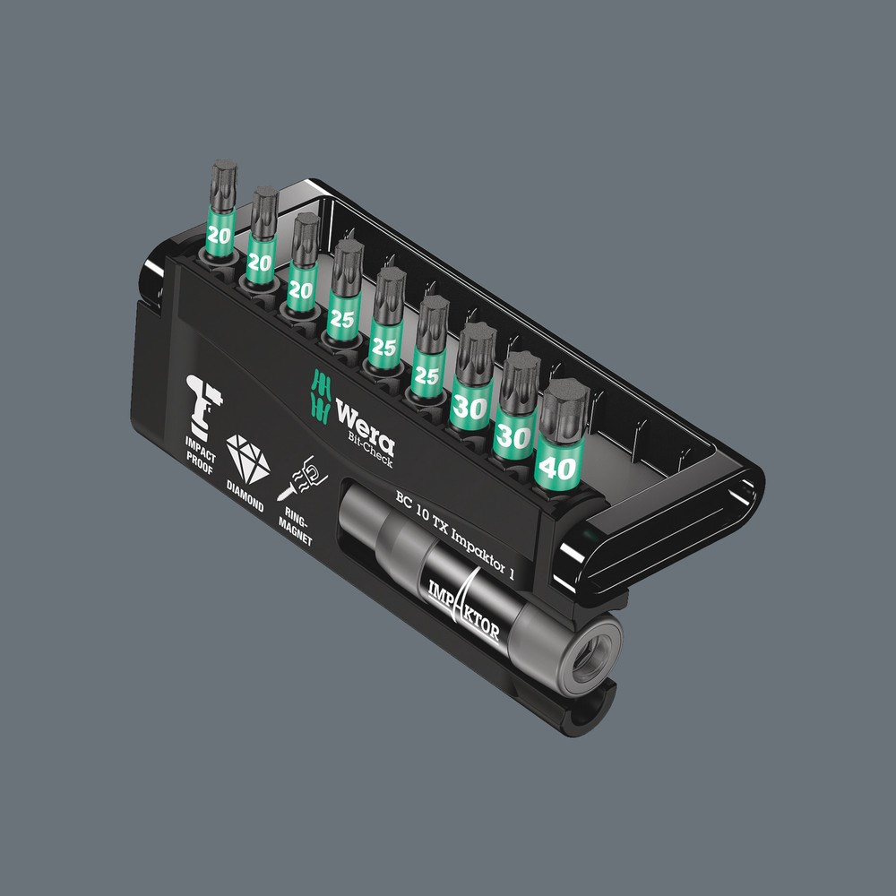 Robuuste Bit-Check van Wera. Bij Bit-Checks heeft u steeds een goed overzicht over het beschikbare gereedschap. Bits die niet nodig zijn voor de werkzaamheden, kunnen in het assortiment worden teruggeplaatst en raken zo niet kwijt. Eenvoudig mee te nemen, bijv. in een borstzak. De Impaktor-technologie zorgt voor een bovengemiddelde gebruiksduur ook onder extreme situaties. Verhoogde wrijvingsweerstand dankzij ruwe diamantdeeltjes op de bitpunt voorkomt het wegglijden uit de schroef. Uitermate geschikt voor gebruik in combinatie met conventionele impact- en slagschroevendraaiers. Impaktor-houder voor het afleiden van extreme belastingspieken. Bijzonder torsie-effect dankzij dubbele torsieveer. Met ringmagneet om ook lange en zware schroeven eenvoudig op de plaats te houden, ideaal voor werkzaamheden boven het hoofd. Uitermate geschikt voor gebruik in combinatie met conventionele impact- en slagschroevendraaiers. Magneet kan teruggeschoven en daarmee uitgeschakeld worden.
