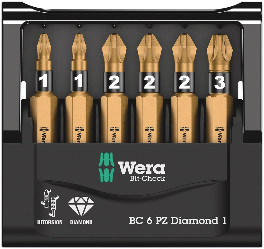 Bits met minuscule diamantdeeltjes op bitpunt. Deze zorgen voor een veilige grip op de schroef, verkleinen de vereiste aandrukkracht en reduceren het risico op wegglijden. BiTorsion-bits met torsiezone, waarin bij belastingspieken kinetische energie wordt afgeleid. Met zachte BiTorsion-zone om torderen van de bit-punt bij hoge belastingen te voorkomen. Hierdoor wordt de levensduur van het product aanzienlijk hoger. Voor plaatsing in de schroefboormachine of in boorkop van een elektronisch geregelde boormachine. De meerdelige Bit-Check overtuigt door het lage gewicht en uitstekende compactheid. Daarbij zorgt het zachte materiaal in het onderste gedeelte van de Bit-Check voor een betere houvast voor de bits en maakt tegelijk het uitnemen daarvan makkelijker. Het profiel en het formaat van de bits zijn gemakkelijk te herkennen dankzij de Wera 'Take it easy'-Toolfinder met kleurcodering en duidelijk zichtbare beschrijving.