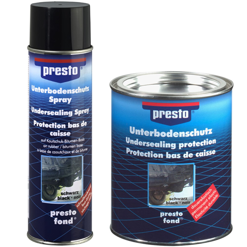 presto Underbody Protection (Bitumen) vormt een visco-plastic, duurzame sealing aan de onderkant van machines, wagens en wielkasten van alle types motorvoertuigen. Het beschermt de onderkant tegen mechanische en chemische stress zoals steenslag, zout, water, roest en weersinvloeden.