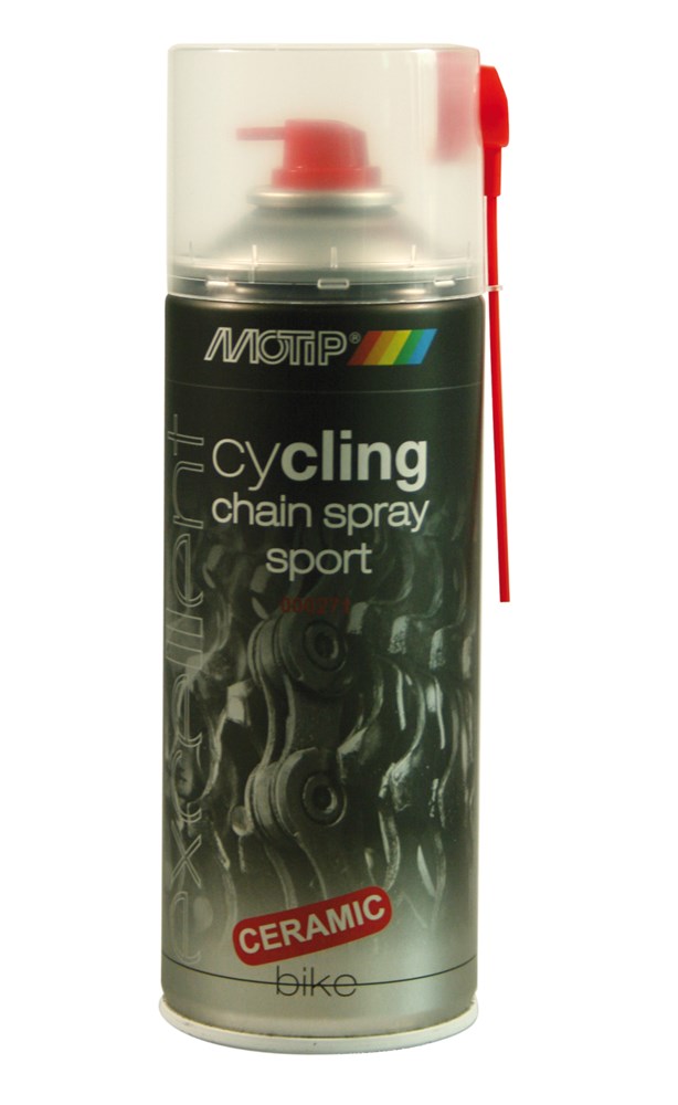 Smeermiddel met keramiekdeeltjes voor het behandelen van kettingen en tandwielen van fietsen. Chain Spray Sport heeft een lage wrijvingscoëfficiënt voor minimale weerstand met behoud van de uitstekende smerende werking, ook bij zware belasting. Speciaal ontwikkeld voor kettingen en tandwielen van racefietsen, crossbikes en mountainbikes. Bij zware condities adviseren wij MoTip Cycling Chain Spray Ultra te gebruiken. Chain spray sport is waterafstotend en bestand tegen weersinvloeden. MoTip Chain Spray Sport voorkomt slijtage en vermindert de vuilaanhechting.