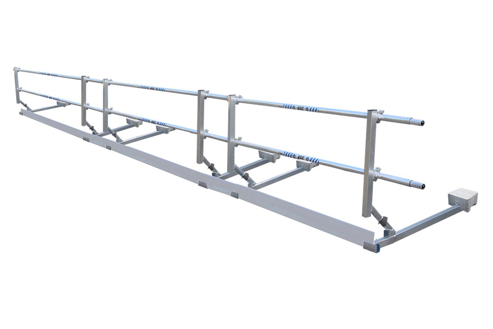 De ASC Dakrandbeveiliging voor plat dak is destijds ontwikkeld door standaard steigermateriaal te combineren met de nieuwste verbindingstechnieken. De dakrandbeveiliging is snel op te bouwen, gemakkelijk in gebruik en maakt van een plat dak een veilige werkomgeving. De oersterke aluminium koppeling dient als staanderklem op de inklapbare dakrandvoet. De aluminium dakrandvoet is vervaardigd uit een 3 mm dik profiel: de perfecte combinatie van gewicht en vooral degelijkheid.