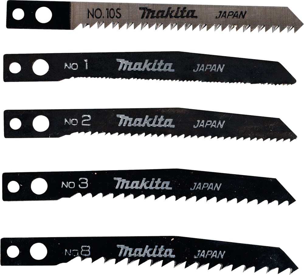 Decoupeerzaagbladenset. Inhoud; 1, 2, 3, 8, 10S. Passend op Makita Model: JV100DZ, JV101DSAE, JV101DSAJ, JV101DSME, JV101DZJ
