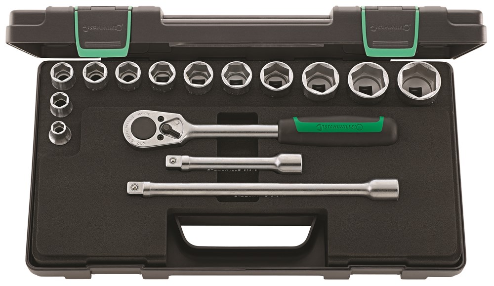 In kunststoffen doos, 15-delig, inhoud: 12 doppen, zeskant nr. 52: 10; 13; 16; 17; 18; 19; 21; 22; 24; 27; 30; 32 mm; 1 ratel nr. 512; 2 verlengstukken nr. 509/5 (130 mm), nr. 509/10 (255 mm).