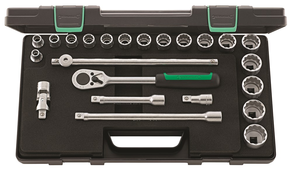 In kunststoffen doos, 23-delig, inhoud: 17 doppen, twaalfkant nr. 50a: 3/8; 7/16; 1/2; 9/16; 19/32; 5/8; 11/16; 3/4; 25/32; 13/16; 7/8; 15/16; 1; 1.1/16; 1.1/8; 1.3/16; 1.1/4"; 1 ratel nr. 512; 3 verlengstukken nr. 509/2 (52 mm), nr. 509/5 (130 mm), nr. 509/10 (255 mm); 1 hendel met schuifstuk nr. 506; 1 cardangewricht nr. 510.