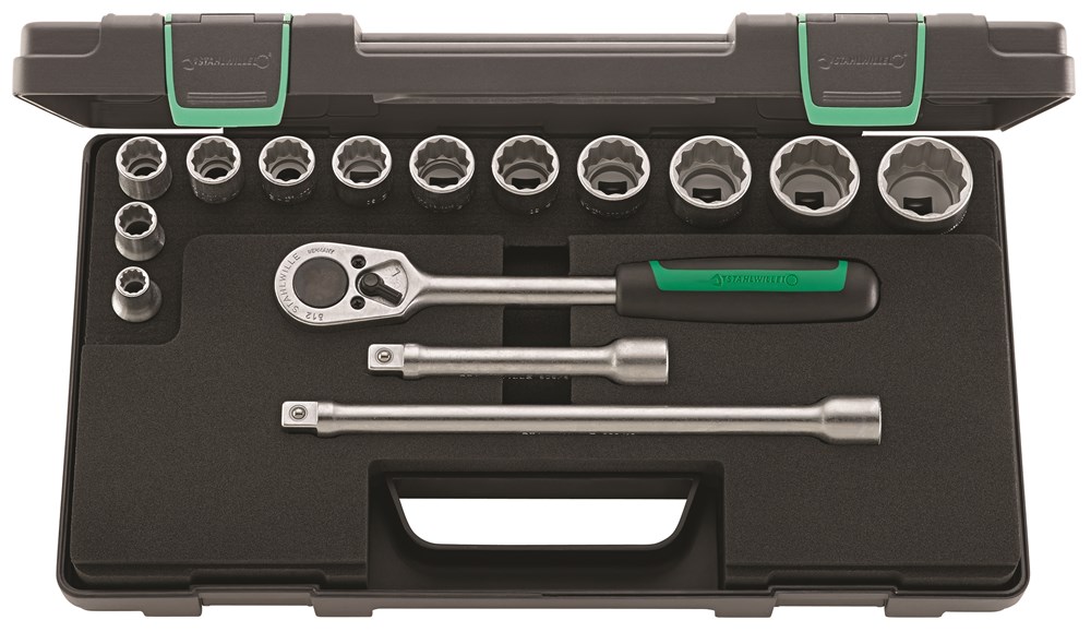 In kunststoffen doos, 15-delig, inhoud: 12 doppen, twaalfkant nr. 50: 10; 13; 16; 17; 18; 19; 21; 22; 24; 27; 30; 32 mm; 1 ratel nr. 512; 2 verlengstukken nr. 509/5 (130 mm), nr. 509/10 (255 mm).