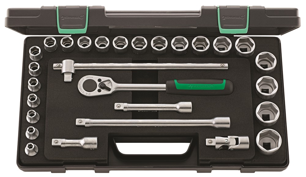 In kunststoffen doos, 28 delig, inhoud: 22 doppen, zeskant nr. 52: 8; 9; 10; 11; 12; 13; 14; 15; 16; 17; 18; 19; 20; 21; 22; 23; 24; 26; 27; 28; 30; 32 mm; 1 ratel nr. 512; 3 verlengstukken nr. 509/3 (75 mm), nr. 509/5 (130 mm), nr. 509/10 (255 mm); 1 hendel met schuifstuk nr. 506; 1 cardangewricht nr. 510.