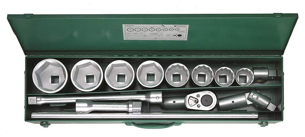 In metalen kist, 14-delig, inhoud: 4 doppen, twaalfkant nr. 60: 46; 50; 55; 60 mm; 4 doppen, zeskant nr. 60: 65; 70; 75; 80 mm; 1 ratelkop nr. 882; 2 verlengstukken nr. 859/8 (200 mm), nr. 859/16 (410 mm); 1 kniegewricht nr. 884; 1 schuifstuk nr. 886; 1 handgreep nr. 888.