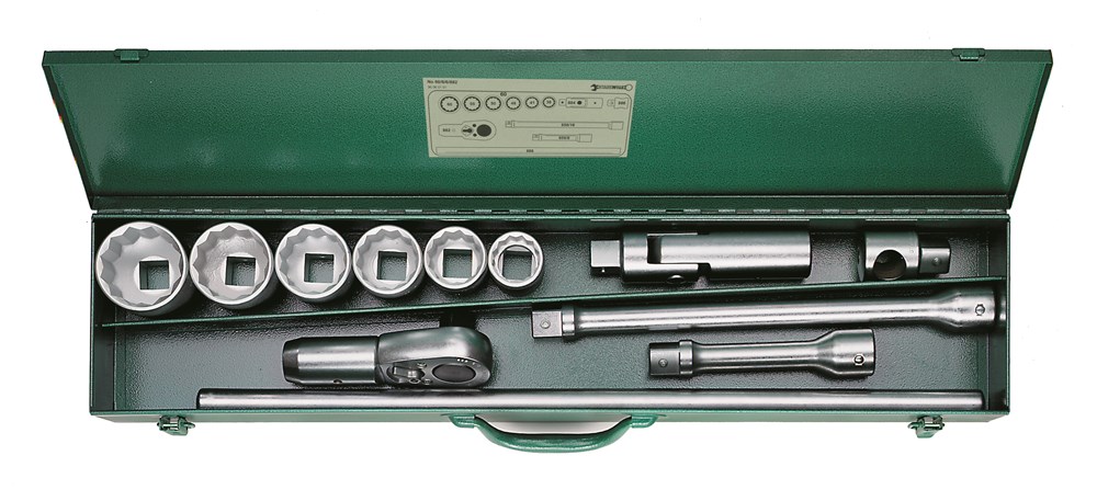 In metalen kist, 12-delig, inhoud: 6 doppen, twaalfkant nr. 60: 36; 41; 46; 50; 55; 60 mm; 1 ratelkop nr. 882; 2 verlengstukken nr. 859/8 (200 mm), nr. 859/16 (410 mm); 1 kniegewricht nr. 884; 1 schuifstuk nr. 886; 1 handgreep nr. 888.