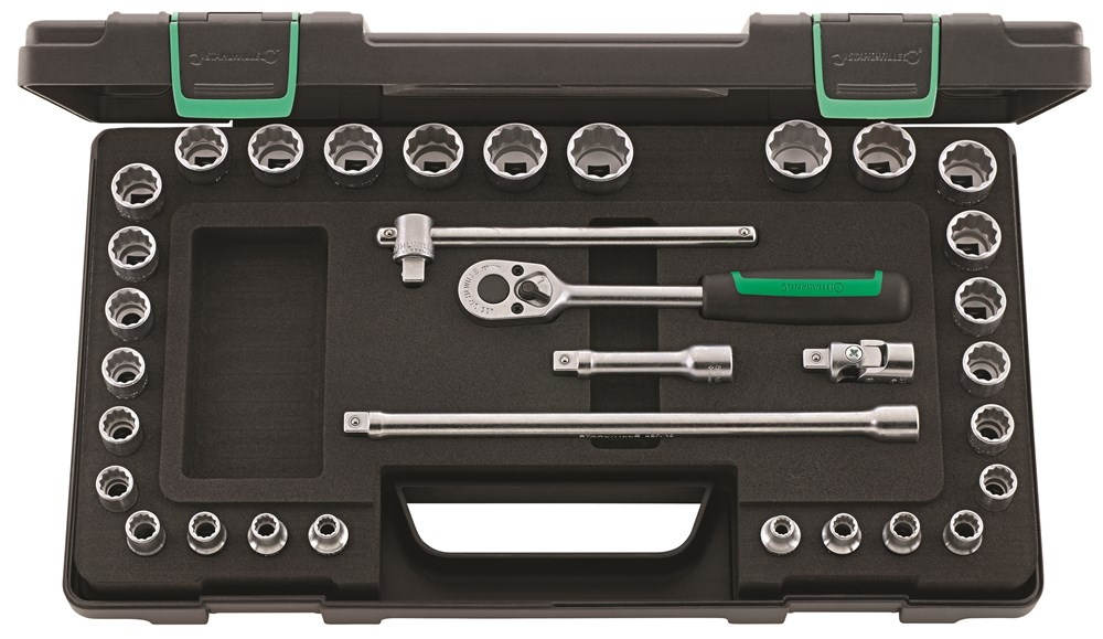 In kunststoffen doos, 33-delig, inhoud: 28 doppen, twaalfkant nr. 45: 7; 8; 9; 10; 11; 12; 13; 14; 15; 16; 17; 18; 19; 20; 21; 22 mm; nr. 45a: 1/4; 5/16; 11/32; 3/8; 7/16; 1/2; 9/16; 5/8; 11/16; 3/4; 13/16; 7/8"; 1 ratel nr. 435; 2 verlengstukken nr. 427/3 (76 mm), nr. 427/10 (240 mm); 1 hendel met schuifstuk nr. 425; 1 cardangewricht nr. 428.