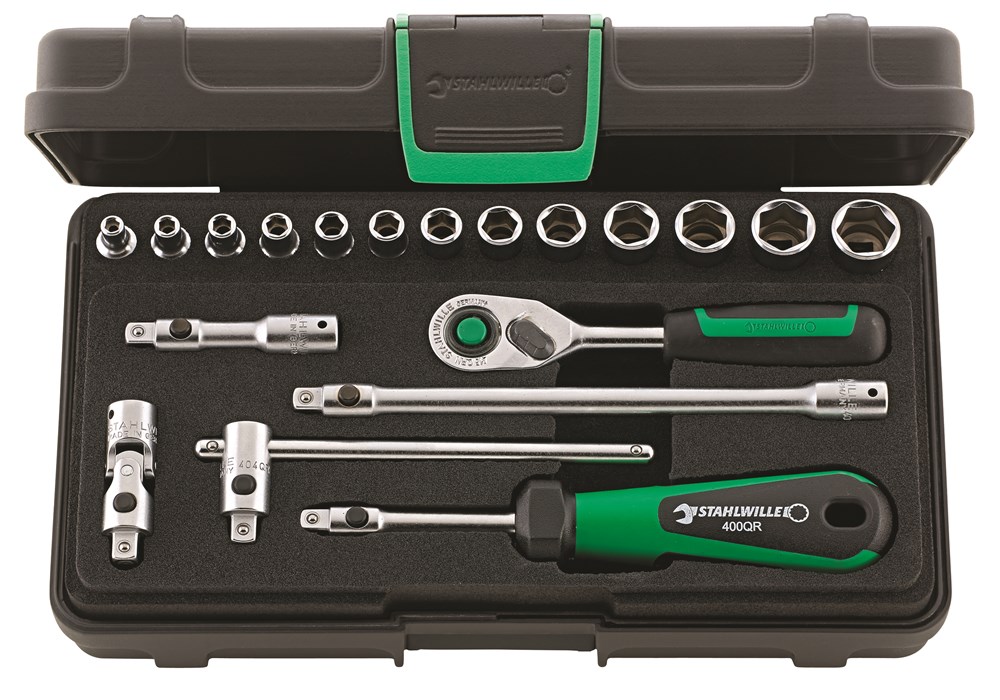 In kunststoffen doos, 19-delig, inhoud: 13 doppen, zeskant nr. 40: 3,5; 4; 4,5; 5; 5,5; 6; 7; 8; 9; 10; 11; 12; 13 mm; 1 ratel nr. 415QRN; 2 verlengstukken nr. 405QR/2 (54 mm), nr. 405QR/6 (150 mm); 1 cardangewricht nr. 407QR; 1 steekhecht nr. 400QR; 1 hendel met schuifstuk nr. 404QR.