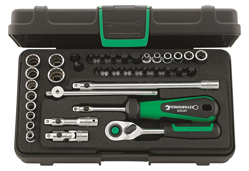 In kunststoffen doos, 32-delig, inhoud: 10 doppen, twaalfkant nr. 40D: 5; 5,5; 6; 7; 8; 9; 10; 11; 12; 13; 5 inbusdoppen nr. 44K: 3; 4; 5; 6; 8 mm; 2 schroevendraaierdoppen voor kruiskopschroeven nr. 44P: gr. 1; 2; 6 Torx doppen nr. 40TX: E4; E5; E6; E7; E8; E10; 9 Torx doppen nr. 44KTX: T8; T9; T10; T15; T20; T25; T27; T30; T40; 1 ratel nr. 415QRN; 2 verlengstukken nr. 405QR/2 (54 mm), nr. 405QR/6 (150 mm); 1 cardangewricht nr. 407QR; 1 steekhecht nr. 400QR; 1 hendel met schuifstuk nr. 404QR.