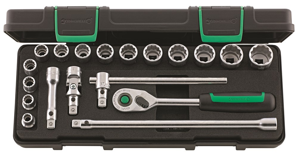In kunststoffen doos, 19-delig, inhoud: 14 doppen, twaalfkant nr. 45: 8; 9; 10; 11; 12; 13; 14; 15; 16; 17; 18; 19; 21; 22 mm; 1 ratel nr. 435QRN; 2 verlengstukken nr. 427QR/3 (76 mm), nr. 427QR/10 (240 mm); 1 hendel met schuifstuk nr. 425QR; 1 cardangewricht nr. 428QR.