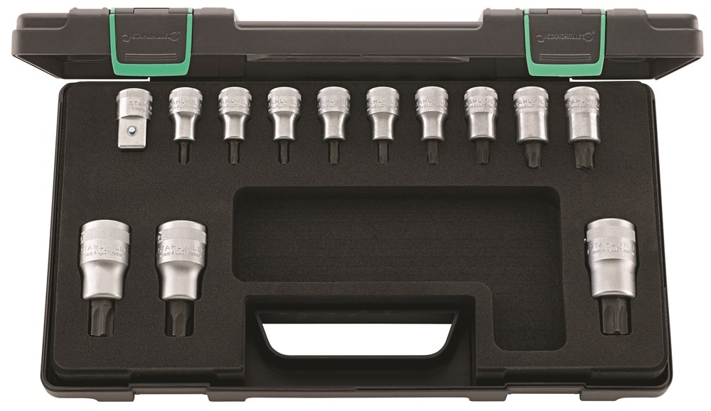 In kunststoffen doos, 12-delig, voor inwendige TORX®-bouten, inhoud: 9 doppen nr. 54TX: T20; T25; T27; T30; T40; T45; T50; T55; T60; 3 doppen nr. 59TX: T70, T80, T90.