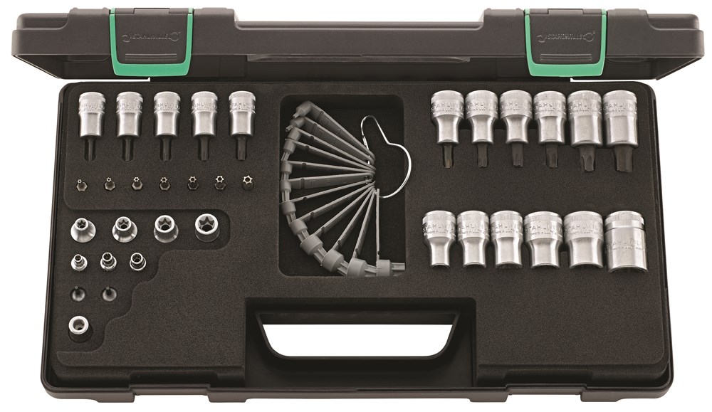 In kunststoffen doos, 35-delig. Inhoud: 3 doppen voor uitwendige TORX®-bouten nr. 40TX: gr. E4; E5; E6; 2 schroevendraaierdoppen voor inwendige TORX®-bouten nr. 44KTX: gr. T8; T9; 4 doppen voor uitwendige TORX®-bouten nr. 45TX: gr. E7; E8; E10; E12; 5 schroevendraaierdoppen voor inwendige TORX®-bouten nr. 49TX: gr. T10; T15; T20; T25; T27; 6 doppen voor uitwendige TORX®-bouten nr. 50TX: gr. E11; E14; E16; E18; E20; E24; 6 schroevendraaierdoppen voor inwendige TORX®-bouten nr. 54TX: gr. T30; T40; T45; T50; T55; T60; 7 schroevendraaierbits voor inwendige TORX®-bouten met boorgat nr. 1440: T10, nr. 1441: T15, nr. 1442: T20, nr. 1443: T25, nr. 1444: T27, nr. 1445: T30, nr. 1446: T40; 1 bithouder nr. 442; 1 TORX®-kaliber: gr. E6; E7; E8; E10; E12; E14; E16; T10; T15; T20; T25; T27; T30; T40; T45; T47; T50; T55; T60.