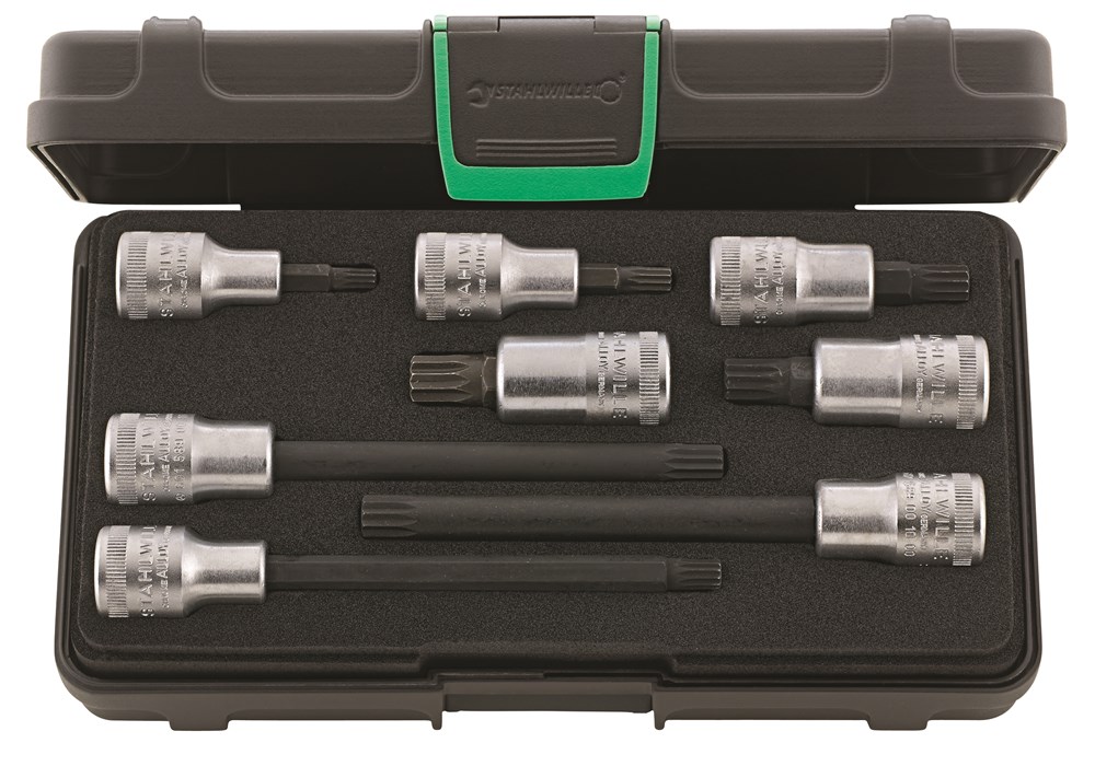 In kunststoffen doos, 8-delig, voor binnenveeltandbouten (XZN®), inhoud: 5 doppen nr. 54X: M6, M8, M10, M12, M14; 3 doppen, lang nr. 3054X: M8, M10, M12.