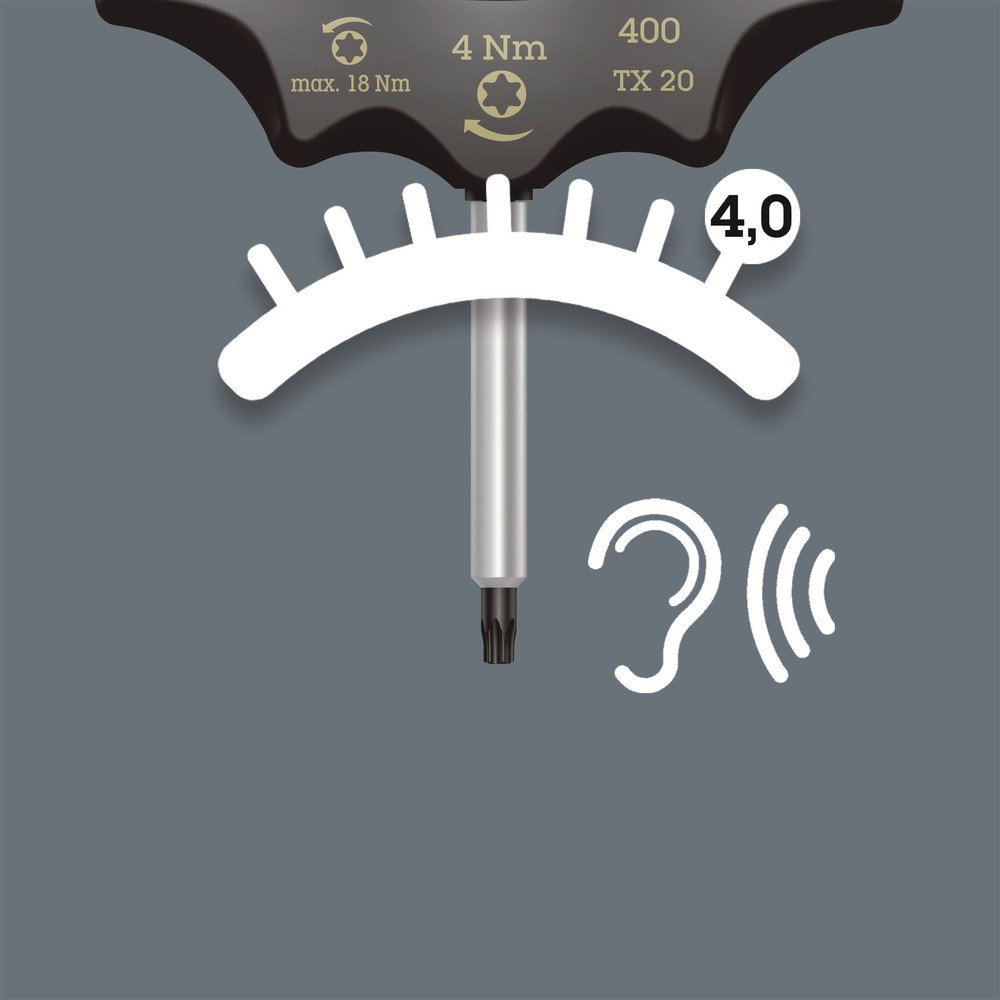 Wera draaimomentindicator met vast ingestelde draaimomentwaarde voor binnenzeskant- en TORX® schroeven. Beveiligd tegen manipulatie. De robuuste slipkoppeling staat garant voor een duidelijk hoorbaar en voelbaar signaal zodra de ingestelde draaimomentwaarde wordt bereikt; overschrijden van het draaimoment is dan ook onmogelijk. Aanzienlijk hoger losdraaimoment dan de ingestelde draaimomentwaarde, waardoor er in de meeste gevallen geen extra gereedschap vereist zal zijn voor het losdraaien van schroefverbindingen. Dankzij de vorm van de greep wordt de bal van de hand goed opgevuld en komen de vingers in de zacht afgeronde inkepingen in de greep te liggen. Daardoor is een optimale, ergonomische krachtoverdracht gewaarborgd.