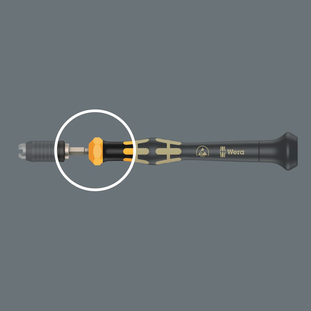 Met volgens klantspecificatie vast vooringesteld draaimoment. De draaimomentwaarde kan met speciaal-gereedschap binnen het meetbereik worden veranderd (herkalibratieset, te bestellen onder artikelnr. 05137004001). Daarna met normaal in de handel verkrijgbaar draaimomenttester de ingestelde waarde controleren. Compact handgreep/wisselkling-systeem voor precisieschroeven met vast ingesteld draaimoment. De Kraftform Micro ESD-draaimomentschroevendraaier is ideaal voor het vastdraaien met een draaimoment van elektrostatisch gevoelige componenten Geschikt voor bits met 4 mm Halfmoon-aandrijving (Wera reeks 9) en bits met 4 mm HIOS-aandrijving (Wera reeks 21). Beveiligd tegen manipulatie. Duidelijk hoor- en voelbaar doorratelen bij bereiken van het ingestelde draaimoment. Herhalingsnauwkeurig 100% gegarandeerd. Onbegrensd handmatig losdraaimoment. Elektrische oppervlakteweerstand < 10^9 Ohm voor goede beveiliging tegen elektrostatische energie. Wordt geproduceerd conform DIN EN 61340-5-1. Handgreep/wisselkling-systeem voor snel wisselen van de kling. Met Kraftform Micro-handgreep met draaibare kap en sneldraaizone voor snel draaien - geen tijdrovend ompakken meer nodig. Krachtzone met geïntegreerde zachte delen voor overdracht van hoge losdraai- en aanhaalmomenten. Precisiezone direct boven kling voor de juiste draaihoek bij instelwerkzaamheden. Razendsnelle bit-bevestiging: Bit in houder schuiven, wordt automatisch vergrendeld, veilige bevestiging. Voor het vervangen van bits eenvoudig de houder naar voren schuiven en bit uitnemen. Vrijlopende huls voor eenvoudig geleiden van gereedschap tijdens het schroeven. Bits geschikt voor hand- en machineschroefbewegingen (o.a. HIOS, Delvo, Sehan). Ideaal voor gebruik bijvoorbeeld bij smartphones, mobiele telefoons, camera's, elektronische apparatuur, in tandtechnische laboratoria en tandartspraktijken.