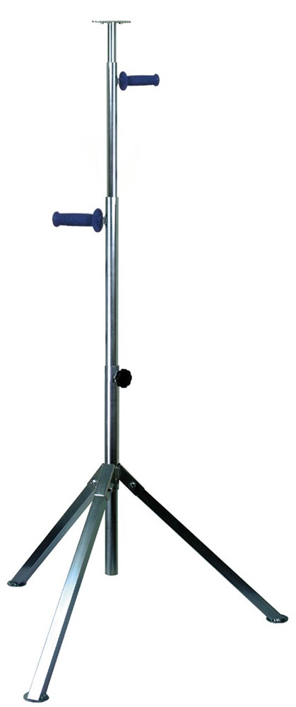 Driepootstatief van verzinkt staal voor verlichtingsarmaturen, voorzien van ronde voetplaten met gat voor fixatie en met inwendige draad M10 voor het bevestigen van zwenkwielen. Inclusief bevestigsmateriaal, M8 bouten en moeren.