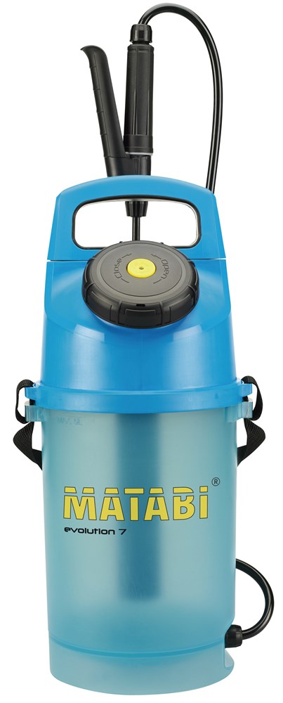 Matabi drukspuit met een uniek innovatief design, een capaciteit van 5 liter, transparant reservoir, aparte vulopening, FPM pomp afdichting, adapter voor accessoires en rvs veer in handvat.