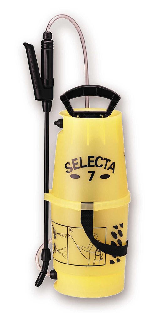 Selecta 7 drukspuit met een capaciteit van 5 liter, transparant reservoir, glasvezellans, FPM pomp afdichting, filter met NBR dichtingen en adapter voor accessoires.