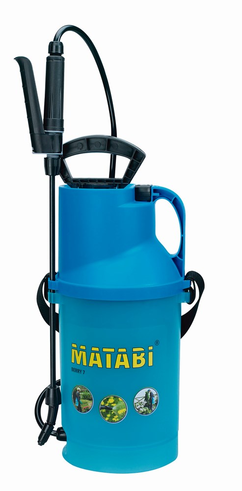 Matabi drukspuit met een capaciteit van 5 liter, transparant reservoir, glasvezellans, FPM pomp afdichting, filter met NBR dichtingen, rvs veer in handvat en adapter voor accessoires.