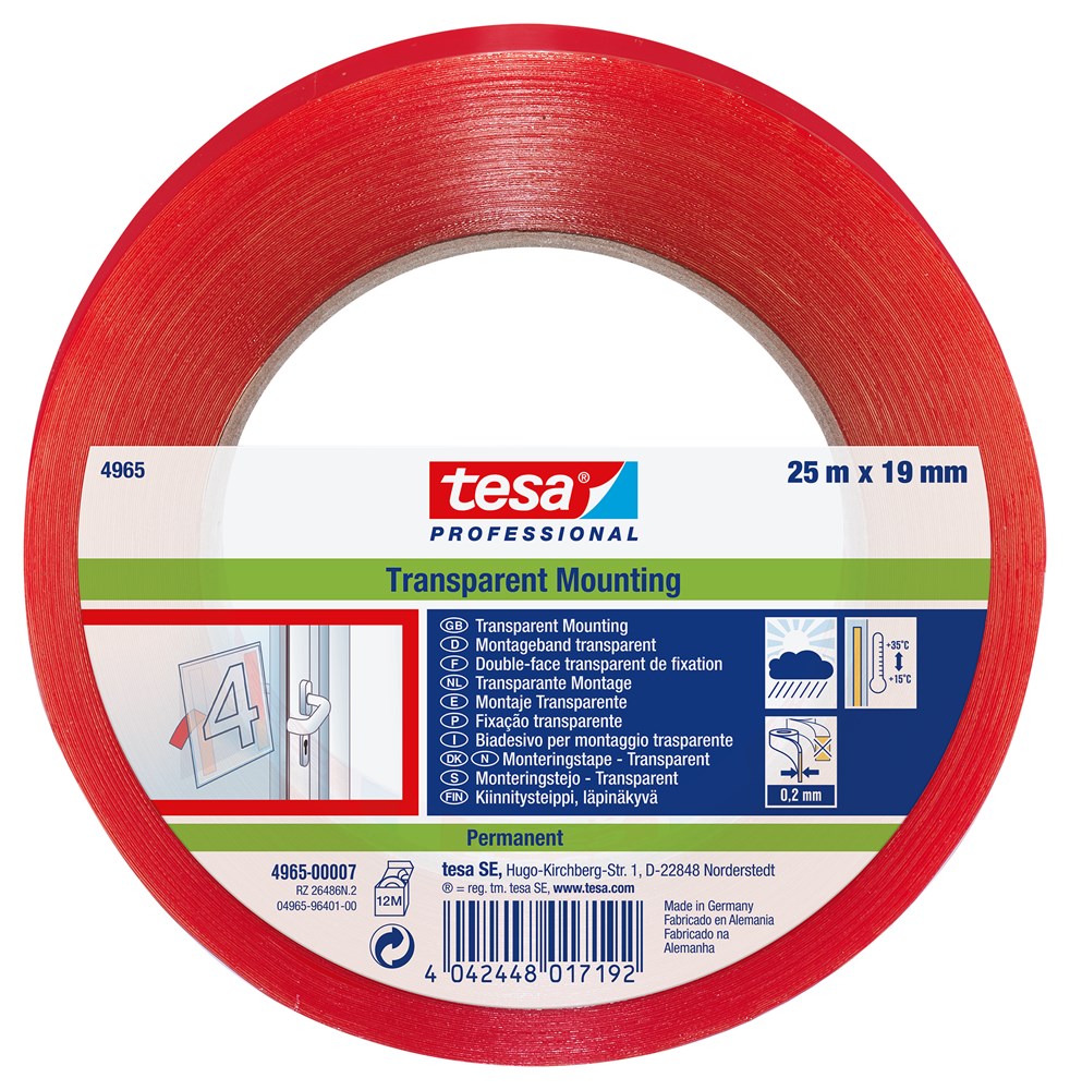 tesa® 4965 is een dubbelzijdige en transparante polyestertape voorzien van een acrylaatkleefstof. Omdat hij goed bestand is tegen weekmakers, hecht hij uitstekend op verschillende kunststoffen zoals ABS, PVC, PE of EPDM. De polyestertape is gemakkelijk te gebruiken en is een betrouwbare hulp wanneer bijv. vormstukken of profielen bevestigd moeten worden.
