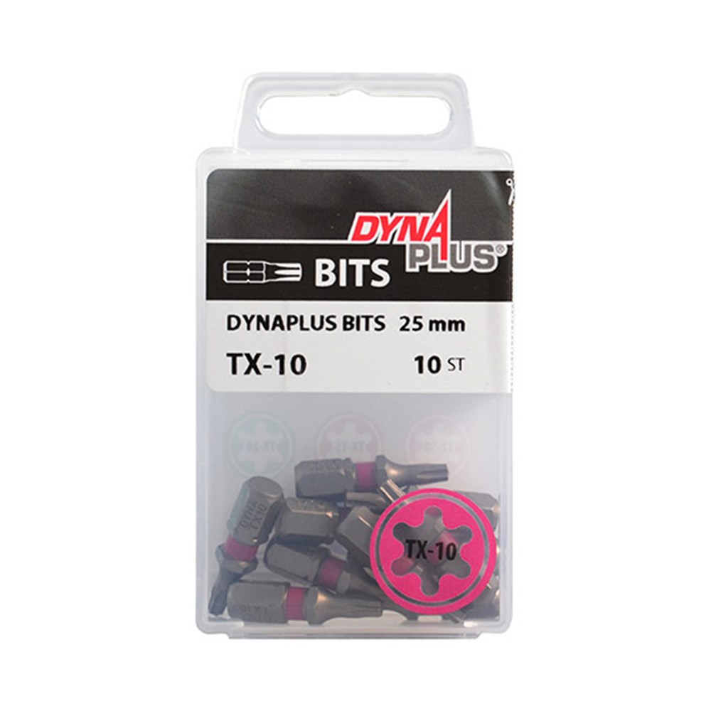 Iedere DYNA TX-drive bit heeft een kleurbandje met een eigen kleur, deze kleur vind je ook terug op het etiket van het doosje. Als je verschillende afmetingen TX-schroeven gebruikt moet je soms van bitje wisselen. Verschillende bitjes zijn slecht herkenbaar en dat maakt bitjes wisselen lastig. Ons nieuwe kleursysteem lost dit probleem op! De DYNA bits zijn, net als de Dynaplus schroeven, van professionele kwaliteit. Ze zijn gemaakt van S2 gelegeerd gereedschapsstaal en zijn licht conisch gevormd voor een stabiele bit-fit en meer grip tijdens het inschroeven. De bitjes zijn per 10 stuks verpakt in een handige afsluitbare bewaarblister.