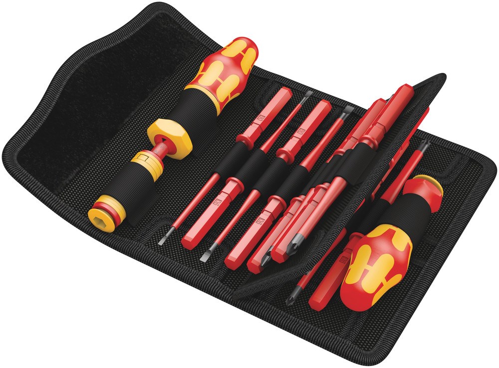 16-delige draaimoment-VDE-wisselklingenset. Inclusief 14 klingen (waarvan 11 met geringere klingdiameter) met geïntegreerde veiligheidsisolatie. Draaimoment-VDE-handhouder met instelbaar draaimoment van 1,2 - 3,0 Nm. Voorzien van ergonomische Kraftform Plus-handgreep; harde gripzones zorgen hierbij voor een hoge werksnelheid, zachte gripzones voor een hoge draaimomentoverdracht.