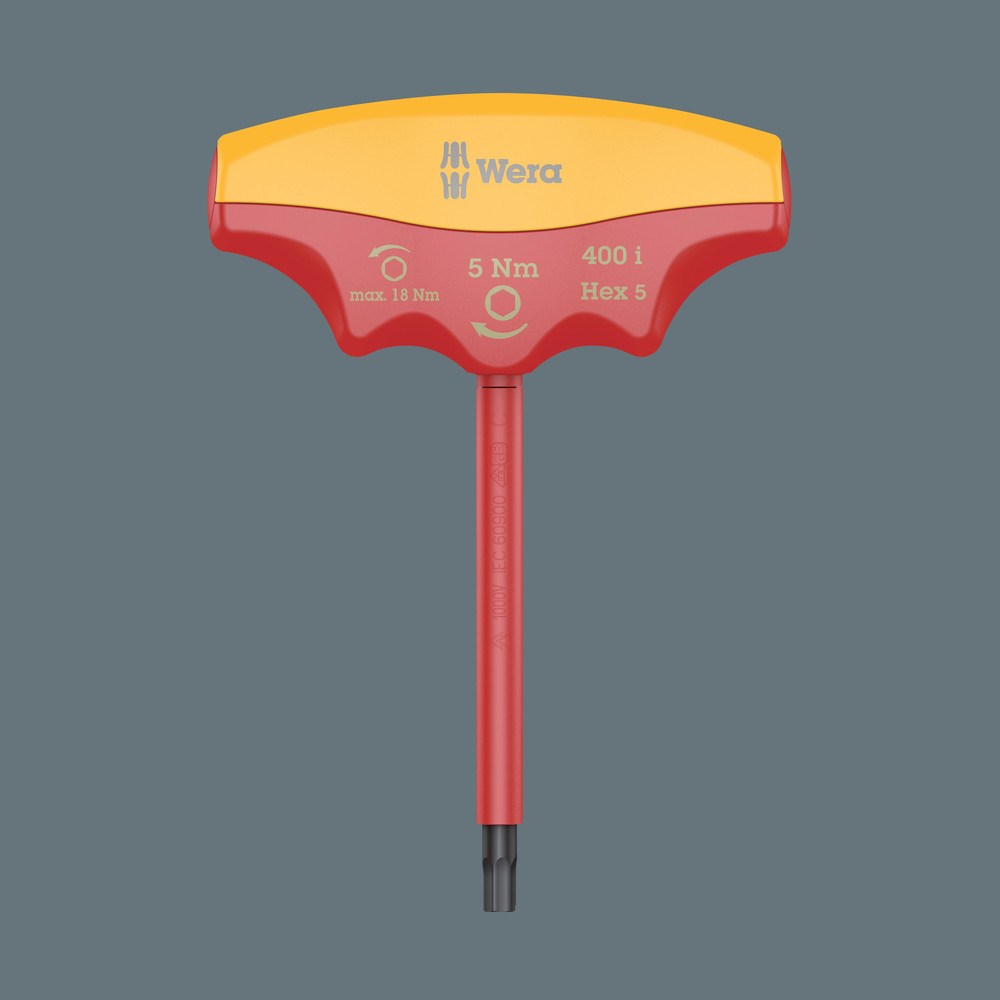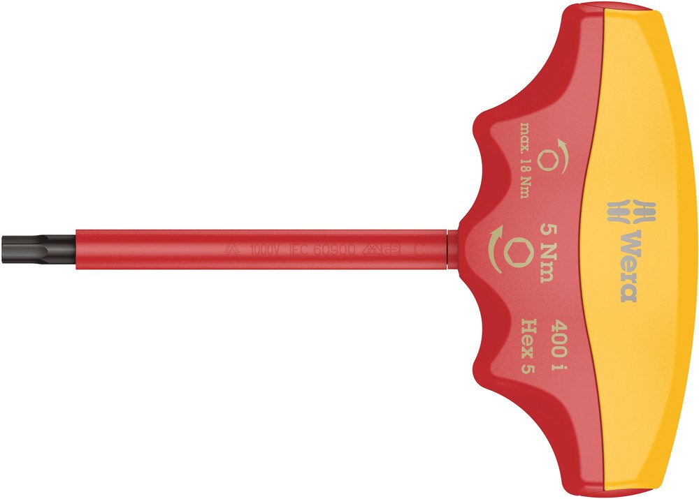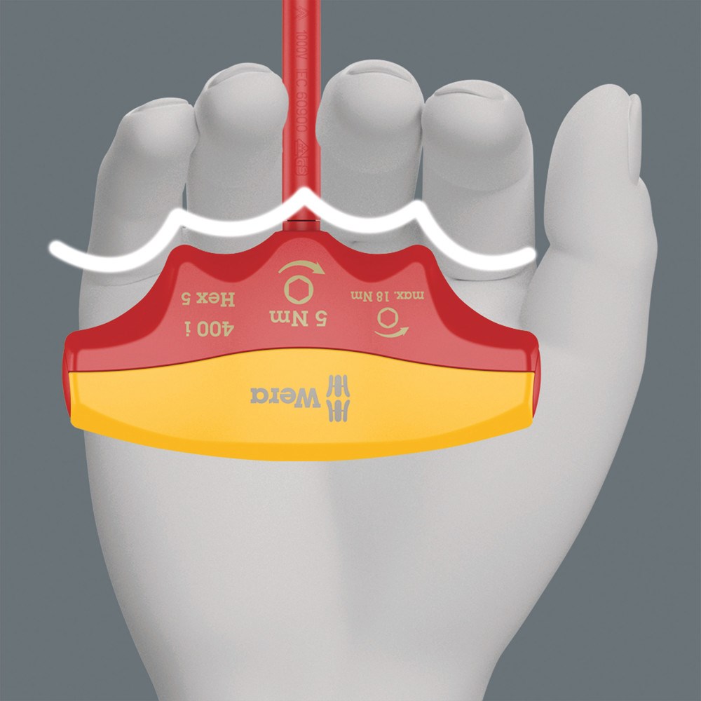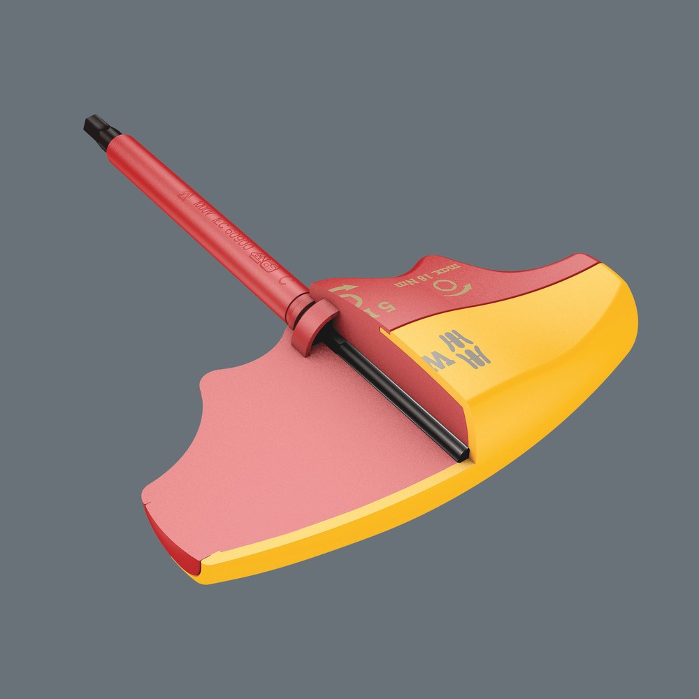 Wera draaimomentindicator met vast ingestelde draaimomentwaarde voor binnenzeskant-schroeven. Beveiligd tegen manipulatie. De robuuste slipkoppeling geeft een duidelijk hoorbaar en voelbaar signaal af zodra de ingestelde draaimomentwaarde wordt bereikt; overschrijden van het draaimoment is dan ook onmogelijk. Aanzienlijk hoger losdraaimoment dan de ingestelde draaimomentwaarde, waardoor er in de meeste gevallen geen extra gereedschap vereist zal zijn voor het losdraaien van schroefverbindingen. Dankzij de vorm van de greep wordt de bal van de hand goed opgevuld en komen de vingers in de zacht afgeronde inkepingen in de greep te liggen. Daardoor is een optimale, ergonomische krachtoverdracht gewaarborgd. Individueel getest comform IEC 60900 in waterbad bij 10.000 V voor veilig werken bij de toegelaten spanning van 1.000 V.