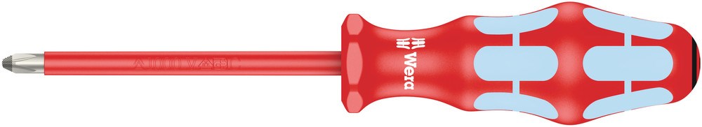 Hoogwaardige Kraftform Plus VDE-schroevendraaier van RVS. Al het RVS gereedschap van Wera wordt vacuümijsgehard en beschikt daardoor over de vereiste hardheid en vastheid voor de schroefwerkzaamheden. Industrieel gebruik is zonder enige beperking mogelijk. Het stuksgewijs testen van de Kraftform Stainless VDE-schroevendraaiers in een waterbad bij 10.000 V conform DIN EN 60900 (IEC 60900) biedt de garantie voor veilig werken bij de toegelaten spanning van 1.000 V. Ook onder extreme gebruikscondities is de veiligheid gewaarborgd; het gereedschap wordt immers getest op koudslagvastheid bij -40 °C. Meerdelige Kraftform-handgreep voor snel en veilig werken. Met "Take it easy" toolfinder": Kleurcodering op profiel en maatcode. Zeskantige wegrolbescherming verhindert telkens wegrollen op de werkplek.