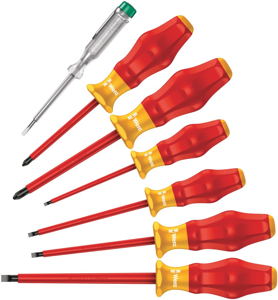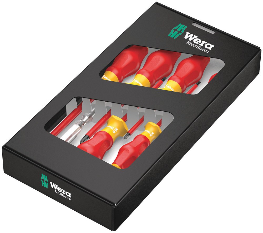 Hoogwaardige Wera Kraftform Comfort VDE-schroevendraaierset. Meerdelige Kraftform-handgreep voor snel en veilig werken. De Wera Black Point-punt en een uitgebreide harding garanderen een lange gebruiksduur van de punt en zorgen voor extra corrosiebescherming en een hoge pasnauwkeurigheid. Individueel getest in waterbad bij 10.000 V voor veilig werken bij de toegelaten spanning van 1.000 V. Zeskantige wegrolbescherming verhindert telkens wegrollen op de werkplek. Met greepcodering om het gereedschap sneller te kunnen vinden en sorteren. Inclusief spanningszoeker.