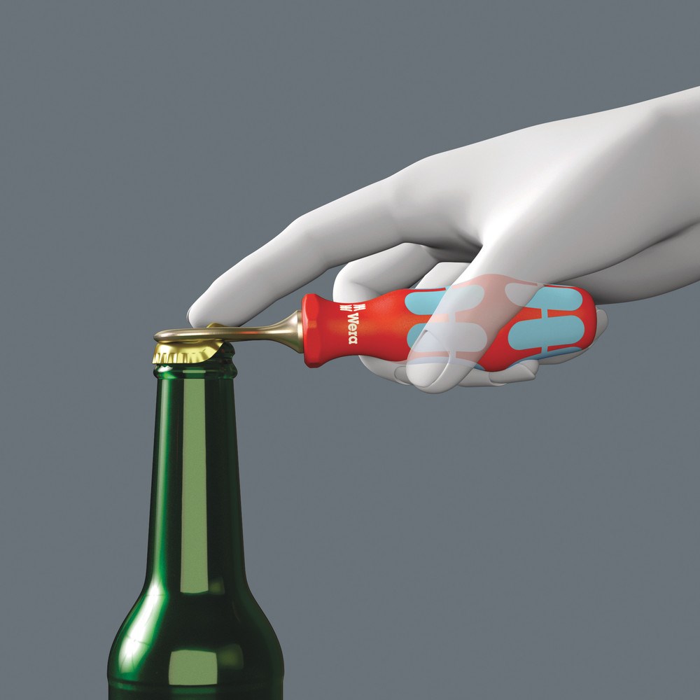 6-delige VDE schroevendraaier set. Hoogwaardige Kraftform Plus VDE-schroevendraaierset van RVS van Wera. Al het RVS gereedschap van Wera wordt vacuümijsgehard en beschikt daardoor over de vereiste hardheid en vastheid voor de schroefwerkzaamheden. Industrieel gebruik is zonder enige beperking mogelijk. Het stuksgewijs testen van de Kraftform Stainless VDE-schroevendraaiers in een waterbad bij 10.000 V conform DIN EN 60900 (IEC 60900) biedt de garantie voor veilig werken bij de toegelaten spanning van 1.000 V. Ook onder extreme gebruikscondities is de veiligheid gewaarborgd; het gereedschap wordt immers getest op koudslagvastheid bij -40 °C. Overwegend met Lasertip-punt: De Lasertip-punt grijpt zich vast in de schroefkop en voorkomt wegglijden uit de schroefkop. Meerdelige Kraftform-handgreep voor snel en veilig werken. Met "Take it easy" toolfinder": Kleurcodering op profiel en maatcode. Zeskantige wegrolbescherming verhindert telkens wegrollen op de werkplek. Met Wera Cult flessenopener.