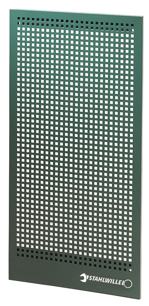 Perforatie 9 x 9 mm, van 1 mm staalplaat, met 2 versterkende beugels aan de achterkant. In deze beugels bevinden zich de boorgaten voor montage aan de wand. Voor het ophangen van gereedschappen naar eigen inzicht m.b.v. de verschillende haken nr. 8031-nr. 8041.