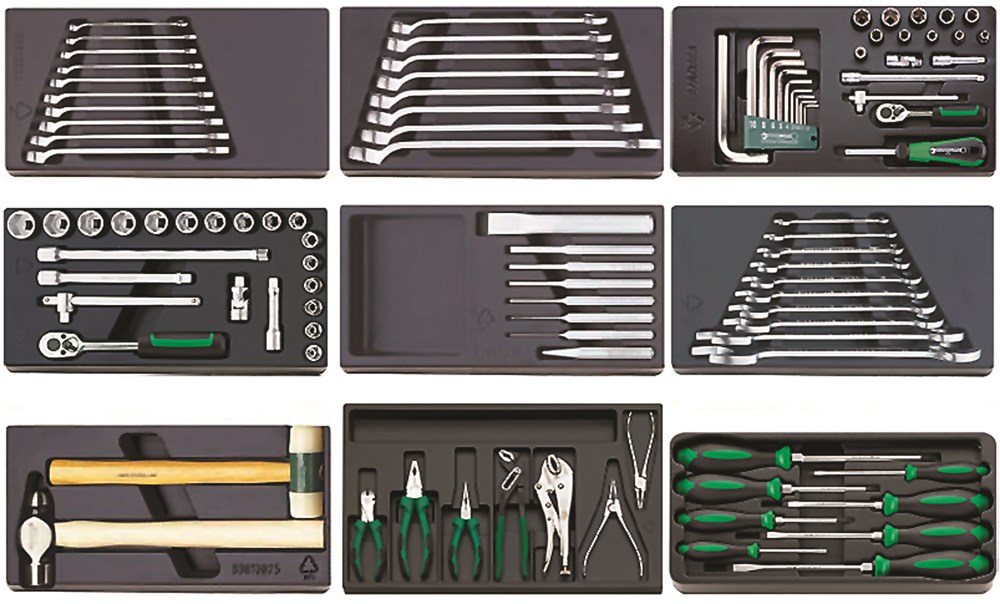 102-delig, in kunststoffen inleg, 9x1/3 en 1x3/3 inleg voor 4 schuifladen, geschikt voor werkbank nr. 92KM G, gereedschapswagens nr. 97N, 97N/KM, 97H/8, 97H/KM; gereedschapskisten nr. 94N, 94N/KM, cassettes-box nr. 920 en Rollbox nr. 922N.