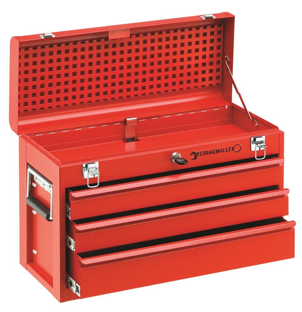 Met 3 schuifladen, een vak onder het deksel (elk 449 x 55 x 185 mm), veiligheidsslot en met kunststof beklede greep bovenop het deksel. Brede, geveerde, met kunststof beklede grepen aan de zijkant. Hoogwaardig, robuust, volledig uittrekbaar glijrailsysteem. De schuifladen zijn eenvoudig uitneembaar. Individuele indeling in het deksel met veerklemmen nr. 8050.